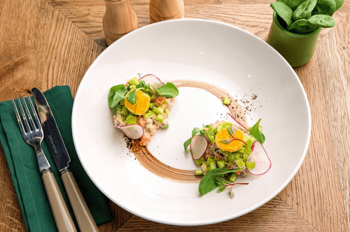 Two parts of mixed salad are piled on the sides, topped with compressed cucumbers. The yolk is breaded and deep-fried. It is cut in half and the halves are placed on the salad. Decorated with mini spinach and a slice of radish.