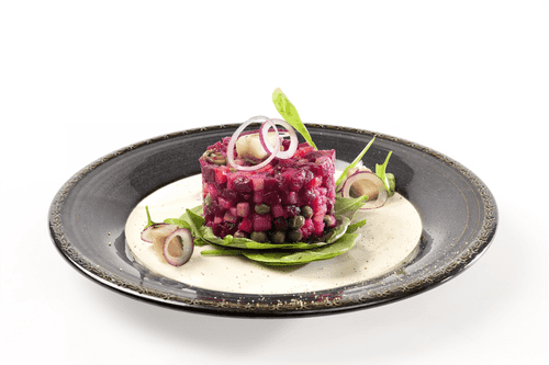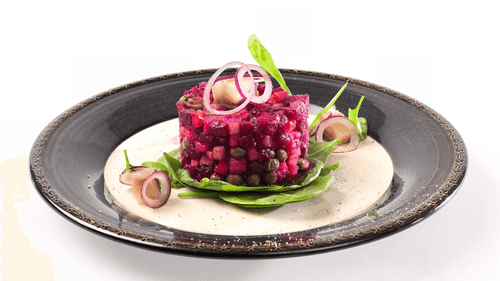 Place spinach leaves on a plate, then layer the vinaigrette using a culinary ring on top of the leaves. Garnish with slices of herring and rings of onion.