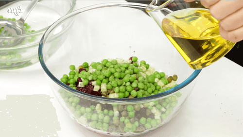 Mix the vegetables with capers and peas, adding fragrant sunflower oil, salt, and pepper to taste.