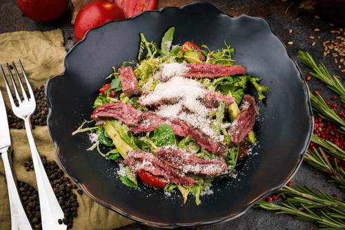 Mix the salad and tomatoes with the dressing, top with slices of diaphragm, and sprinkle with grated parmesan.