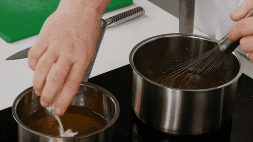 Strain the broths through a sieve into separate saucepans. Add agar-agar to both broths, heat them with stirring using a whisk, but do not bring to a boil.