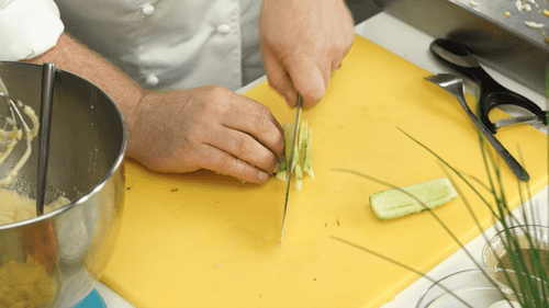 Chop the crab sticks finely and add them to the salad.