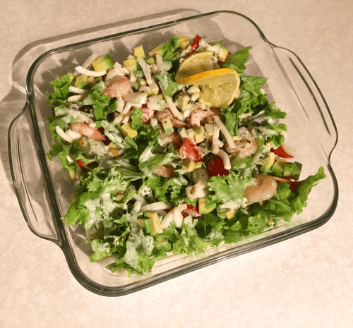 We take a bowl for the salad and add tomatoes, avocado, chopped shrimp, and squid, tearing in some lettuce leaves. We salt the salad to taste. In a small cup, we pour 4-5 tablespoons (to taste) of olive oil, squeeze in a lemon wedge, add salad seasoning (to taste), a bit of ground pepper, mix it all, and pour it over the salad. We mix a little more and finally sprinkle oregano, and you can also drizzle with citrus dressing for salads, but that’s also to taste.