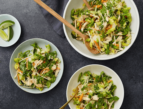 Chop the vegetables: bok choy, kohlrabi, lettuce, green beans, grate the carrot. Mix with sauce and chicken. Season the salad with chopped green onions and cilantro.