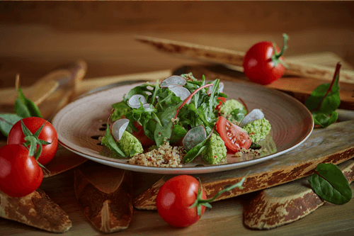 This salad is a vibrant blend of Mexican cuisine and modern gastronomic trends. Avocado guacamole with its creamy texture and citrus notes harmoniously pairs with quinoa, adding nutrition to the dish. Baku tomatoes bring a sweet freshness, while arugula and Swiss chard add a light bitterness and crunch. Creamy balsamic finishes the flavor with a refined touch. Historically, guacamole is an iconic Mexican sauce loved for its simplicity and rich taste. Here it takes on a new form, becoming the base for a light and healthy salad that works well as a standalone dish or side. It can be served as an elegant appetizer or light dinner, complemented by a glass of white wine or fresh lemonade.