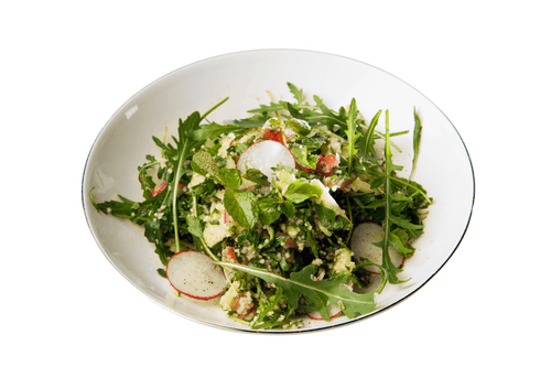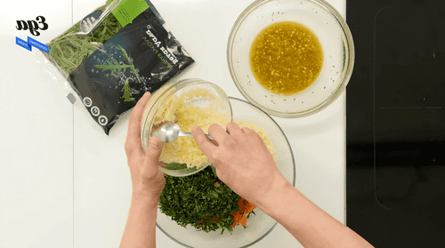 Mix the couscous with vegetables, chopped herbs, arugula leaves, and prepared dressing.