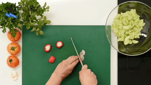 Peel the cucumbers and slice them into half-rings. Remove the seeds from the tomatoes and cut them into strips. Slice the radishes into thin half-rings.