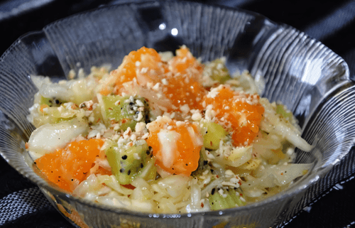 Cabbage and fruit salad is a vibrant combination of freshness and sweetness. Inspired by American cuisine, this recipe combines crunchy red cabbage with juicy apples, oranges, and pomegranate seeds. Walnuts add a light crunch to the dish, while the dressing of honey, balsamic vinegar, and olive oil reveals complex flavor nuances. This salad not only refreshes but also provides nutrients, making it perfect for a light snack or as an accompaniment to a main dish. It can be easily adapted by replacing oranges with mandarins or adding other citrus fruits. This salad delights the eye with its colors and offers pleasant gastronomic pleasure.