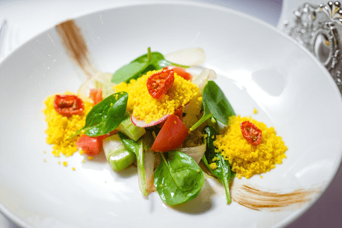 Decorate the bottom of the plate with balsamic cream, arrange vegetables mixed with sauce and couscous. Drizzle with dressing on top and garnish with sun-dried tomatoes, radish slices, and mini spinach leaves.
