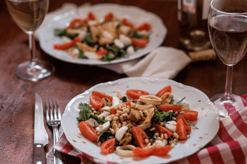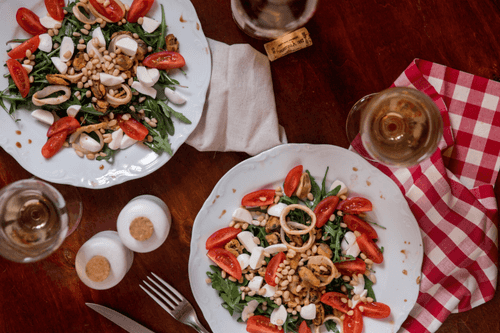 Mix all the ingredients and sprinkle with pine nuts. Serve with white dry wine.