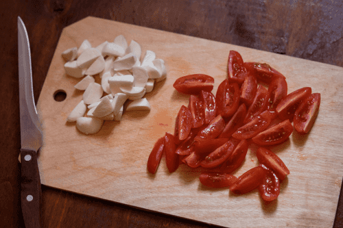 Cut the tomatoes and mozzarella into halves or quarters (I have mini balls of cheese and cherry tomatoes, so if you have regular tomatoes and a large ball of mozzarella - cut them into medium cubes).