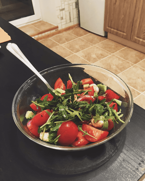 Add salt, dress with olive oil and balsamic vinegar. Mix.