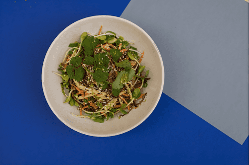 Mix thoroughly and place in a dish. Top with mixed salad, green onions, a bunch of cilantro, and sprinkle with sesame seeds and chopped pistachios. The true spring salad is ready.