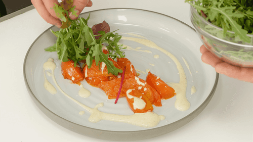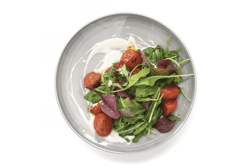 Place the prepared tomatoes on a plate, drizzle with yogurt sauce, and top with a mix of salad leaves.