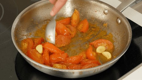 Slice the tomatoes into rings. If the tomatoes are small, cut them into 4 wedges. Sauté them in olive oil for 5 minutes, adding salt towards the end and whole garlic cloves for aroma.