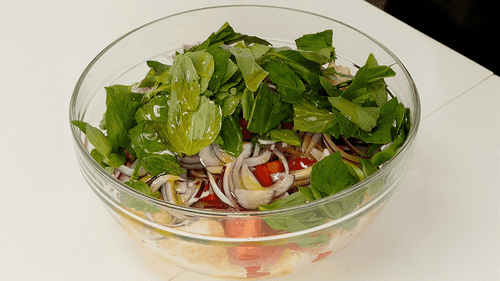 Pour olive oil into the salad.