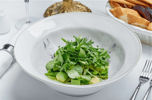 This refined salad is the embodiment of freshness and elegance in French cuisine. It harmoniously combines tender green leaves, creamy avocado, crunchy asparagus, and juicy Kenyan beans, creating a balanced flavor with light nutty and herbal notes. The addition of edamame and zucchini brings textural variety, while the sweet-sour apple and refreshing cucumber add zest. The dressing made from olive oil, apple and lemon juices gives the dish a subtle tanginess and enhances the natural flavors of the ingredients. This salad is an ideal complement to a light summer dinner or an elegant lunch, especially when paired with a glass of white wine. The presentation is adorned with a sprig of fragrant dill, making the dish not only a gastronomic delight but also a visual pleasure.