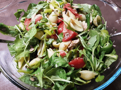 We mix tomatoes, bell pepper, salad leaves (I have arugula and corn) and tuna.