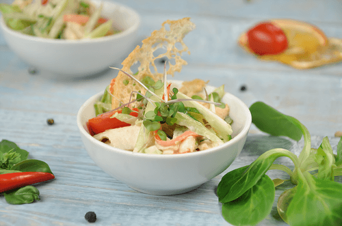 The mini salad 'Waldorf' is a modern interpretation of a classic American dish first created in the late 19th century at the famous Waldorf Astoria hotel in New York. The original version included apples, celery, and mayonnaise, later adding walnuts. Our version is enriched with baked chicken fillet, crispy romaine lettuce, fresh vegetables, and juicy red grapes, creating a harmony of sweetness and spiciness. The crunchy baguette adds textural pleasure while the mayonnaise provides a delicate creamy consistency. This salad is perfect for a light lunch or elegant appetizer, combining simplicity of ingredients with richness of flavor.