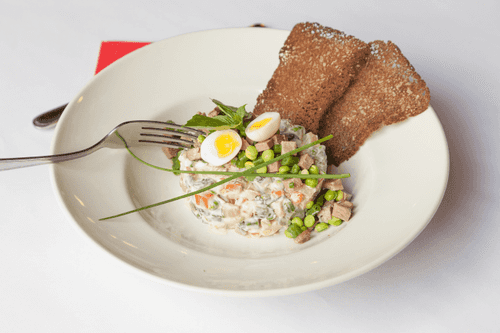 Divide the Olivier into portions, garnish with pieces of tongue and legumes, as well as greens to taste, halved eggs, and Borodino bread croutons.