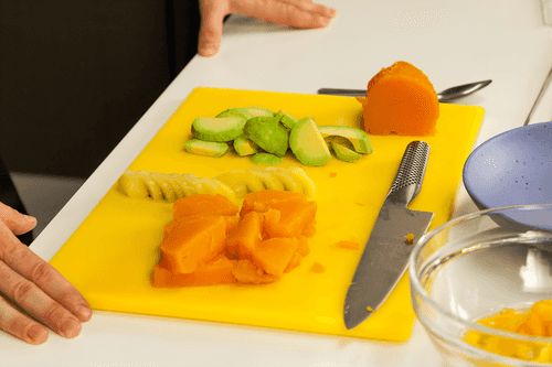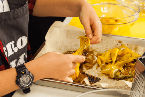Wash the sweet potato, wrap it in foil, and place it in the oven for an hour at 180-190 degrees. Wash the bell peppers and place them on a baking sheet with parchment, sending them to the oven for 15-20 minutes. Peel the cooked peppers and remove the seeds. Cut into large pieces.