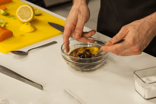 Prepare the dressing: mix olive oil, balsamic cream, and lemon juice.