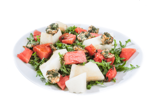 Salad with shrimp, melon, watermelon and arugula