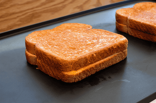 Cut the cheese into pieces and place them on the unbuttered side of the bread. Top with a spoonful of sauce.