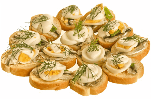 Quail egg sandwiches are a refined dish of French cuisine, combining tenderness and richness of flavors. Historically, quail eggs are associated with the aristocratic traditions of France; their exquisite taste perfectly complements rich appetizers. In this recipe, crispy white or black bread soaked in butter serves as the base for salty cold-smoked fish, adding depth and richness to the sandwich. Halved quail eggs add softness, while herbs and green onions complete the composition with freshness. This is an elegant appetizer that can be served at festive receptions or as a quick yet sophisticated treat for guests. The sandwiches are served chilled, pair perfectly with white wine, and create a harmonious balance of taste and texture.