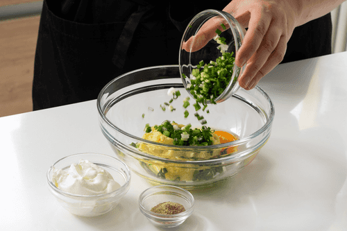 Mix sour cream, egg, finely chopped green onion, and cardamom into the mashed potatoes and stir well to avoid lumps.