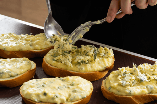 Spread a thick layer of puree on each slice of bread, then add a layer of cheese.