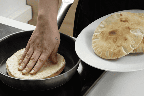 Cut the pita lengthwise and place it on a dry hot skillet, keeping it there until a golden crust forms. The same can be done using a grill.