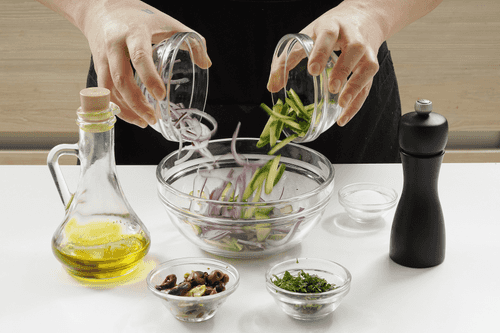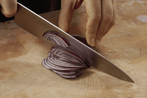 Peel the red onion and slice it into thin half-rings.
