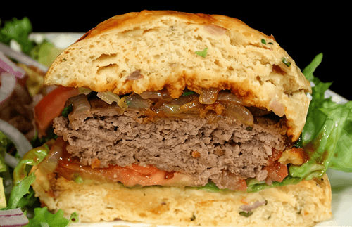 Remove the buns from the grill and make 8 burgers, placing patties, onions, and sliced tomatoes between the halves.