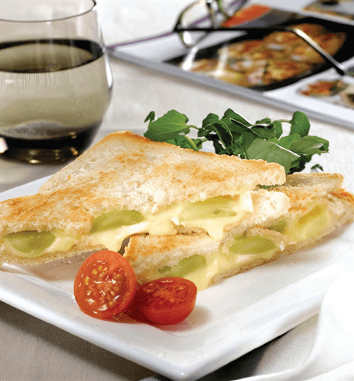 A hot sandwich with brie cheese and grapes is an elegant blend of French cuisine and simplicity in preparation. Brie, a soft and creamy cheese, harmoniously complements the sweetness of grapes, creating a refined contrast of flavors. This recipe has roots in classic French gastronomic art, where cheese and fruits are often paired to create sophisticated appetizers. The bread baked under the grill becomes crispy, while the melted brie envelops the juicy grape berries, giving the sandwich a rich, intense flavor. Perfect for a light dinner or as an exquisite wine appetizer. Adding watercress and tomato refreshes the dish, turning it into a complete meal that delights both in taste and aesthetics. French culinary elegance in simple execution.