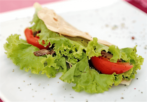 Place the lettuce leaves on the pita, then add tomatoes, fried onions, and bacon on top.