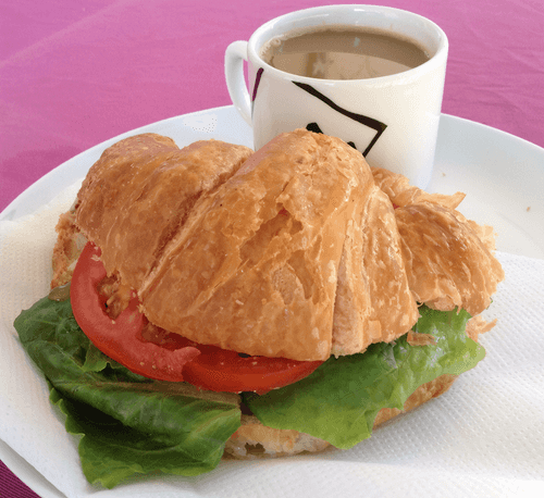 Spread mayonnaise on the croissant, add lettuce leaves, then tuna and tomatoes.