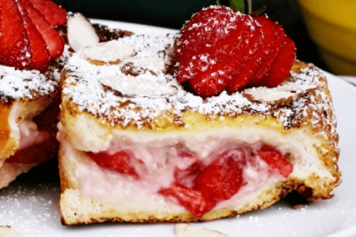 French toast filled with cream cheese and strawberries is a refined combination of airy bread, delicate cream cheese, and fragrant strawberries encased in a golden crispy crust. This dish has its roots in traditional French cuisine, where chefs value the balance of flavors and textures. The gentle sweetness of strawberries, enhanced by strawberry jam, harmonizes with the creamy cheese to create true delight for gourmets. Cinnamon and powdered sugar add a sophisticated sweet note, making the toast not just breakfast but a true gastronomic pleasure. An ideal option for cozy morning meals or an elegant dessert that can be complemented with fresh berries and a cup of aromatic coffee.