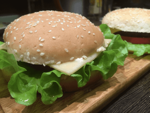 Now we take our buns, cut them in half lengthwise, spread a little mayonnaise on both halves, then add a lettuce leaf, a slice of tomato, a patty, some ketchup, cheese, and cover with the second half.