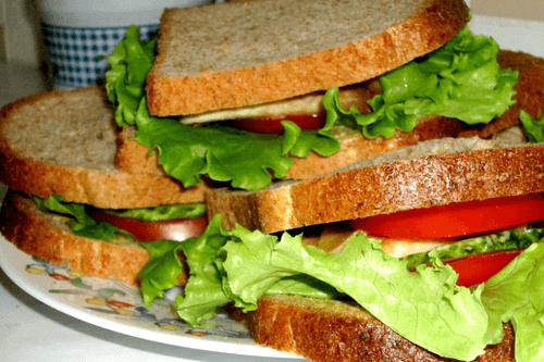 Place lettuce leaves on the toast, then add vegetables, chicken, and cheese.