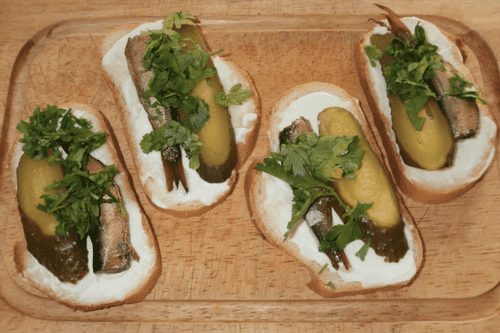 Sandwiches with sprats and pickled cucumber