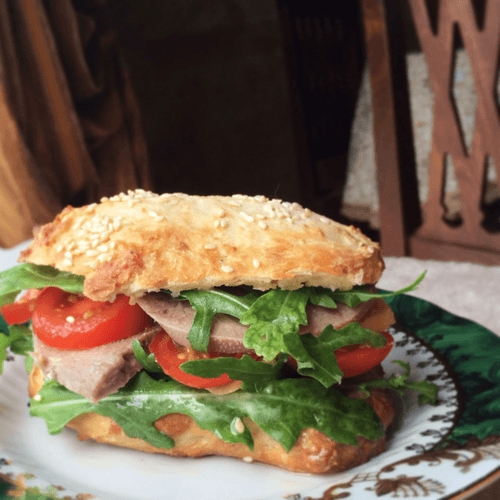 Then let the buns cool and prepare your favorite sandwich. In my case, it was butter, cheese, boiled beef tongue, arugula, and cherry tomatoes.
