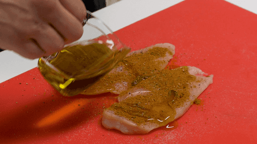 Cut the chicken fillet in half lengthwise, season with salt and pepper, sprinkle with a spice mix, drizzle with olive oil, rub it in and let it marinate for 10 minutes.