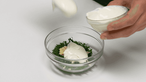 First, prepare the sauce to let it infuse well. For this, mix sour cream, finely chopped herbs, pressed garlic, salt, pepper, and spices.