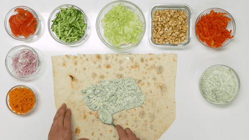 Spread the lavash, apply sauce, and top with vegetables.