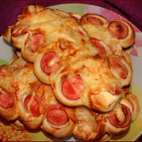 Sausage and parmesan rolls are a cozy dish with Italian notes, perfect for family evenings or friendly gatherings. The recipe is based on soft yeast dough that wraps around smoked sausages, creating a tender texture with a savory filling. Parmesan adds a rich aroma and a slight saltiness to the rolls, making them particularly appetizing. During baking, the rolls acquire a golden crust, while the zigzags of ketchup and fresh dill on top highlight the contrast of flavors. This treat is great as a standalone dish or as an appetizer for festive tables. The origins of the recipe can be linked to Italian culinary traditions where simplicity meets harmony of flavors and baking always takes center stage.