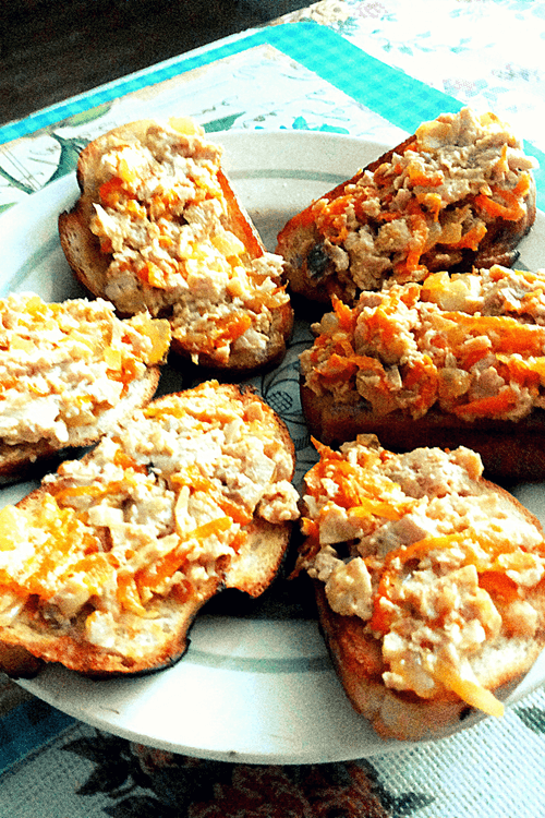 Croutons with cod liver, carrots, and onions are a simple yet elegant dish with deep flavor and rich aroma. Cod liver, known for its tender, buttery taste and high nutrient content, harmonizes with the sweetness of carrots and the spiciness of onions. A light mayonnaise sauce adds a creamy texture, while crispy fried slices of white bread provide an appetizing base for the dish. Such snacks are common in American cuisine, where the combination of simple yet rich flavors is appreciated. These croutons are perfect as an appetizer for a festive table, an addition to a light lunch, or a cozy evening snack. They offer a balance of rich flavors and textures, creating a warm and comforting feeling with every bite.