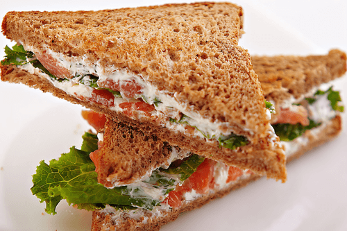 Sandwich with salmon, avocado and green salad