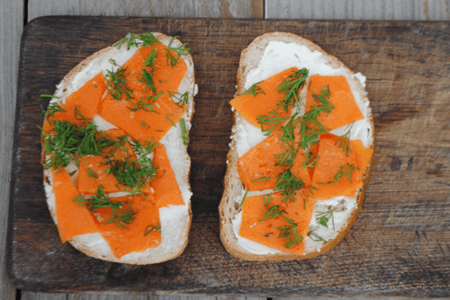 Spread melted cheese on bread, place pumpkin on top, and sprinkle with dill. Bon appétit