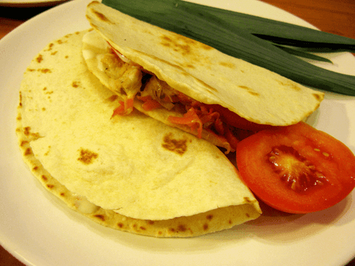 We heat the tortilla on both sides in a dry pan to make it slightly crispy.